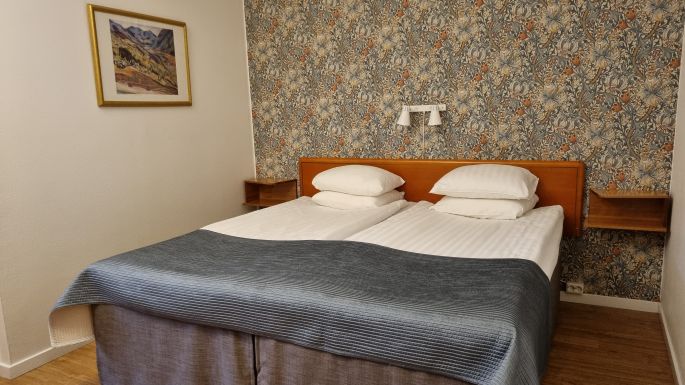 Dubbelrum standard (13-16 m²) är möblerade med två bekväma sängar (2×90 cm). De är bäddade med två sköna kuddar i varje säng. Rummen är utrustade med TV som har både svenska och utländska kanaler, skrivbord, fåtölj/fåtöljer, minikylskåp samt WC/dusch. Frukostbuffé samt WiFi ingår alltid i rumspriset.